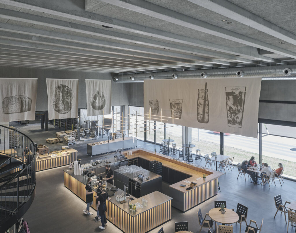 Der eingeschnittene Zugang fungiert als Innenhof-Oase und begrünte Erweiterung der anliegenden Funktionen, diese wirken atmosphärisch auf den zentralen Freiraum. Der Flagshipstore teilt sich in drei Nutzungszonen: Im direkten Anschluss zum Innenhof liegt das Café mit Verkaufsraum und Rösterei sowie der angegliederte Schulungsbereich und Bürotrakt mit seinem großzügigen „work together“ Kreativbereich. Die Backstube, das funktionale Herzstück des Gebäudes, bildet gemeinsam mit dem Café eine zweigeschossige Raumeinheit. Sie prägt bestimmend die rohe Gesamtatmosphäre des Gebäudes, die Bäckerei ist sowohl vom Cafe und Mitarbeiterbereich als auch vom Straßenraum omnipräsent spürbar. Die Nebenräume und die Mitarbeiterzone mit internem Lichthof im Obergeschoß schließen an die Backstube an.